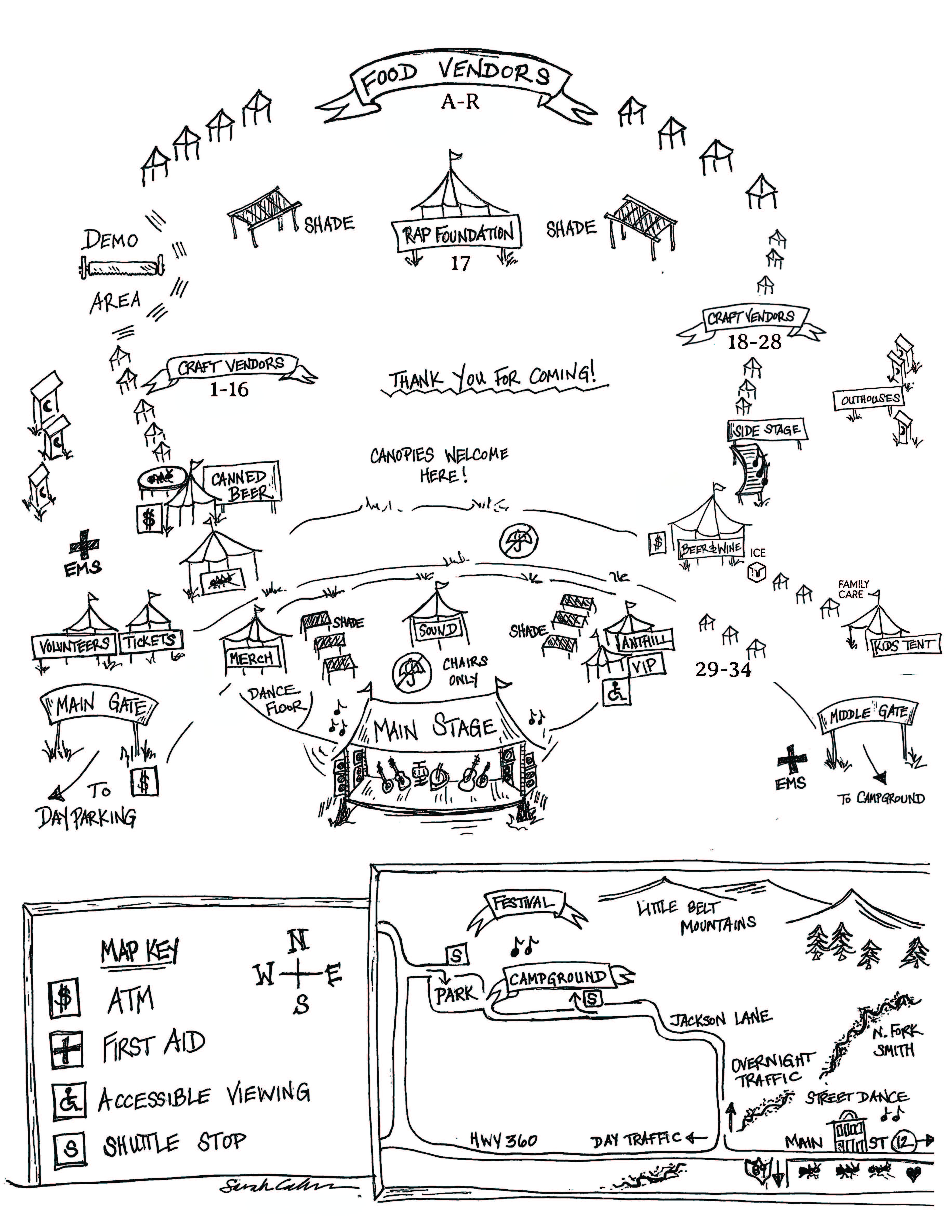 Yellowstone Coffee Roasters (Bozeman, MT): Serving hot drip, cold drinks, breakfast burritos, and sweet treats in the campground at the festival entrance. Open 7AM-12PM.  Located near the entrance to the Festival G3.